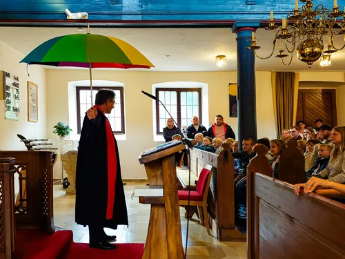 Ein echter Hingucker war der große, bunte Schirm, den Pfarrer Merz mitgebracht hatte. Ob Regen oder Sonnenschein, unter diesem Schirm ist Platz für alle. Symbolisch durften sich die Kinder darunter versammeln, als Zeichen für Gottes Schutz und Geborgenheit. Ein schönes Bild für den gemeinsamen Weg durchs erste Schuljahr!