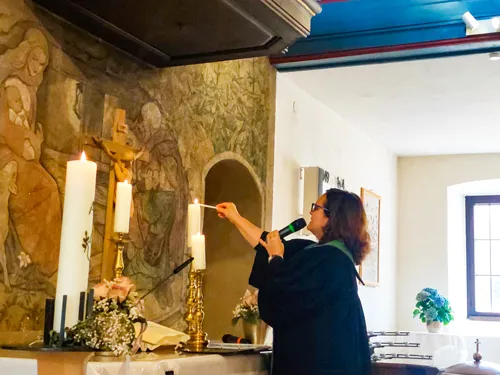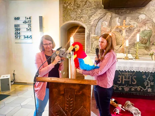 Besonders eindrucksvoll war die symbolische Darstellung der weißen Taube als Friedenszeichen und die liebevoll platzierten Stofftiere wie Elefant und Papagei, die die Vielfalt der Schöpfung sichtbar machten. Ein gemeinsames Gebet und der Segen rundeten die Feier ab.
