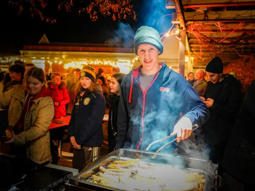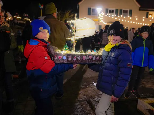 Weiter ging es auf dem festlich beleuchteten Dorfplatz, wo die Besucher ein liebevoll gestalteter Weihnachtsmarkt erwartete. Verschiedene Stände boten Selbstgemachtes, Bratwürste durch die ELJ und warme Getränke (SVB) an. Traditioneller Höhepunkt war wie bereits in den vergangen Jahren das Lichterschiffchen fahren, bei dem die Kinder Ihre sebst gebasteslten Boote mit Hilfe der Feuerwehr Aurachhöhe in der Aurach zu Wasser lassen konnten.