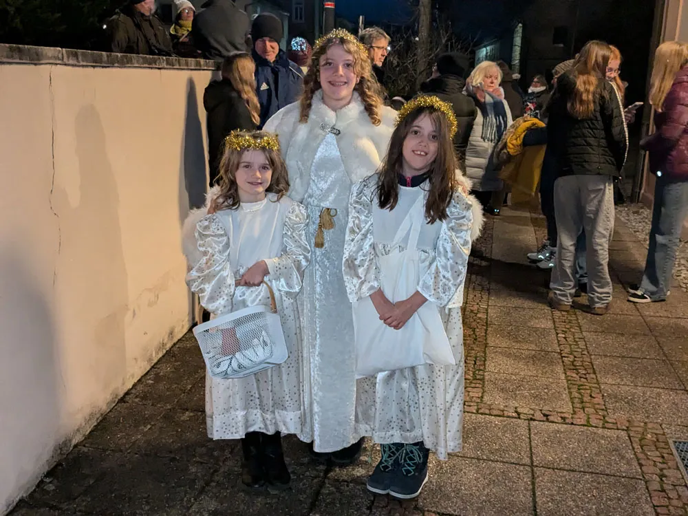 Frau Pfarrerin Judith. Köhler erinnerte ans Wunschzettel schreiben: Den Kindern ist es sicherlich leicht gefallen, ihre Wünsche aufzuschreiben. Doch den Erwachsenen fällt das schwerer. Erfüllt man sich die kleinen Wünsche durchaus mal selbst, bleiben dann doch nur die großen Wünsche übrig. Diese großen Wünsche schreibt man dann eigentlich nicht auf einen Wunschzettel, man bringt sie vor Gott in unseren Gebeten. Gott ist nur nicht der Weihnachtsmann oder das Christkind. Gott ist das Kind in der Krippe, das erwachsen wird: Brot teilt, Wunden heilt und Leben für alle bringt. Nach mehreren gemeinsamen Liedern begleitet durch den Posaunenchor, schwebte noch das Drauracher Christkind mit ihren Engelchen in unsere Kirche.