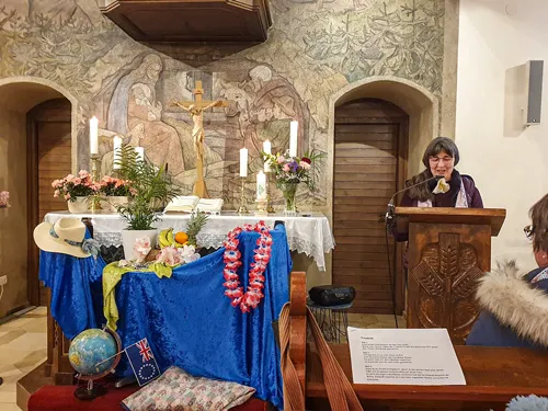Der Gottesdienst startete mit dem Begrüßungswort „Kia orana“ und einem schwingenden Tuch, das zu Beginn die Wellen des Ozeans darstellte. “Kia orana” diese Begrüßung in der Maori Sprache wiederholte sich während des gesamten Gottesdienstes. In der Übersetzung wird sie folgender Bedeutung zugeordnet “Ich wünsche dir, dass du lange und gut lebst, dass du leuchtest wie die Sonne und mit den Wellen tanzt” (Auszug aus der Gottesdienstordnung). Die Atemmeditation mit Meeresrauschen durch Ozeantrommel und Wellen ließ die Besucherinnen kurz innehalten. Die aufwendig gestaltete Beamer-Präsentation zeigte sowohl Einblicke in das 16.000 Kilometer entfernte Land als auch die wunderbaren Wellen des Meeres. Auch die Einspielung der Liedtexte erfolgte über dieses Medium.