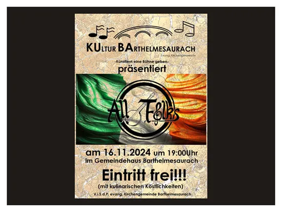 Die Gruppe „Kultur Barthelmesaurach“ der Kirchengemeinde Barthelmesaurach lädt zum Konzert mit „All folks“ ein.