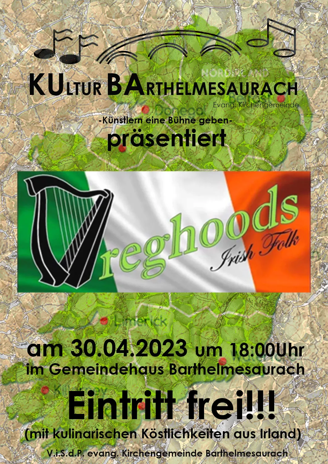 (Akkustik-und E-Gitarre, Gesang) und Jörg Kalkowski (Gitarre) fanden dann schnell weitere Musiker, die Spaß an der Irischen Musik und irischen Mentalität hatten. Im April 2013, mittlerweile eine Band mit 5 musikbegeisterten Mitstreitern, bestehend aus 2 Gitarristen, einem Bassisten, einem Mandolinenspieler und einem Schlagzeuger, hatten die Dreghoods dann ihren ersten Auftritt im Probenraum vor ausgewähltem 30 Mann/Frau starkem Publikum.Seit der Zeit hatten die Dreghoods diveres Auftritte in und um Schwabach. Nach dem Auftritt im März 2020 begann der große Umbruch. Wolfgang, Uwe und Marion kommen dazu, so dass sie wieder zu 6. sind und sich auf neue Auftritte freuen können. Wollen Sie mal reinhören? Auf der Website www.dreghoods.de finden Sie Hörproben. Wir freuen uns auf Ihr Kommen mit irischen Köstlichkeiten.